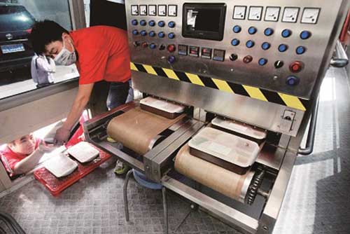 記者在現(xiàn)場(chǎng)看到,這種車是用大巴客車改造的。在大巴車下層放行李的地方有兩臺(tái)發(fā)電機(jī)。而車上全部座椅均被拆除,只剩一臺(tái)帶有兩條傳送帶以及監(jiān)視屏的機(jī)器。工作人員將從冷鏈貨運(yùn)車上搬下來(lái)的盒飯放進(jìn)機(jī)器的一頭,隨著監(jiān)視器上數(shù)字不停地變化,微微冒著熱氣的盒飯出現(xiàn)在傳送帶的另一頭。